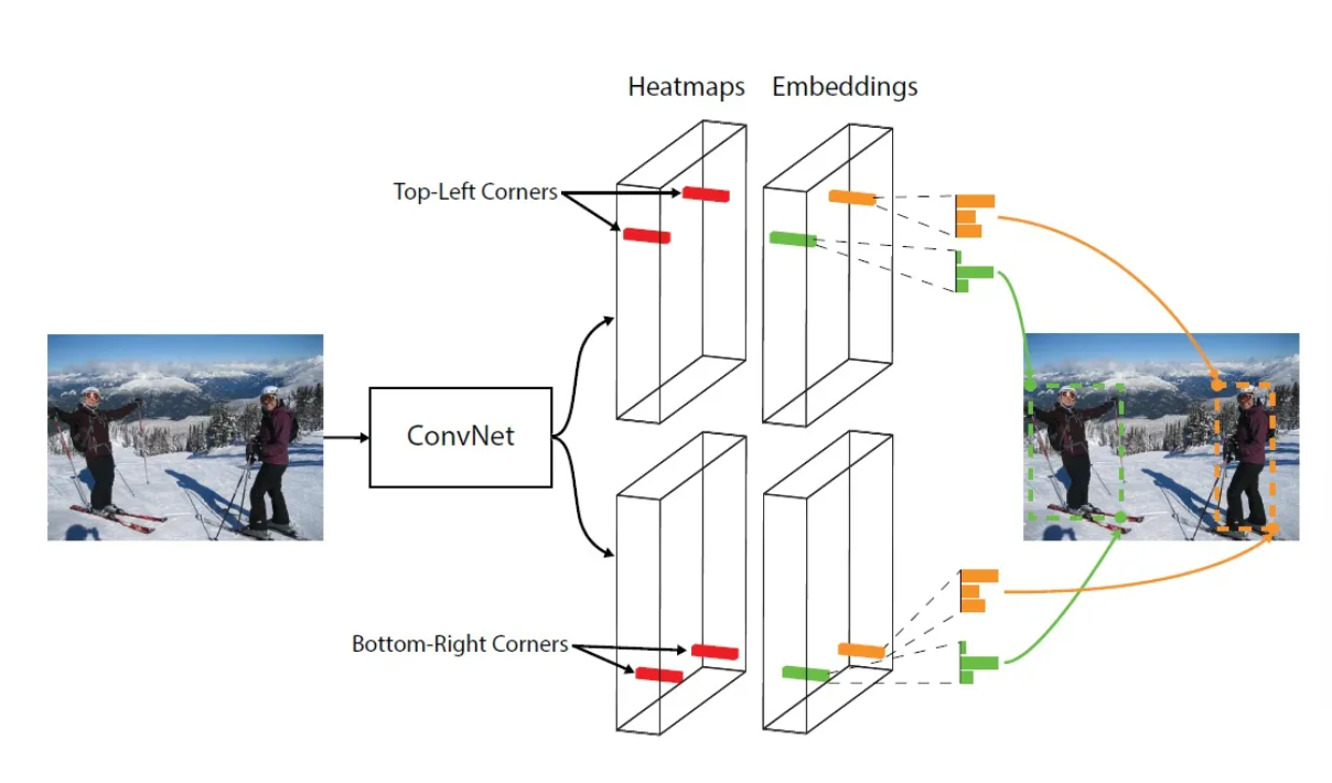 - 什么是一对关键点: 只需要预测物体包围框的左上角坐标和右下角坐标就可以完成对物体的检测