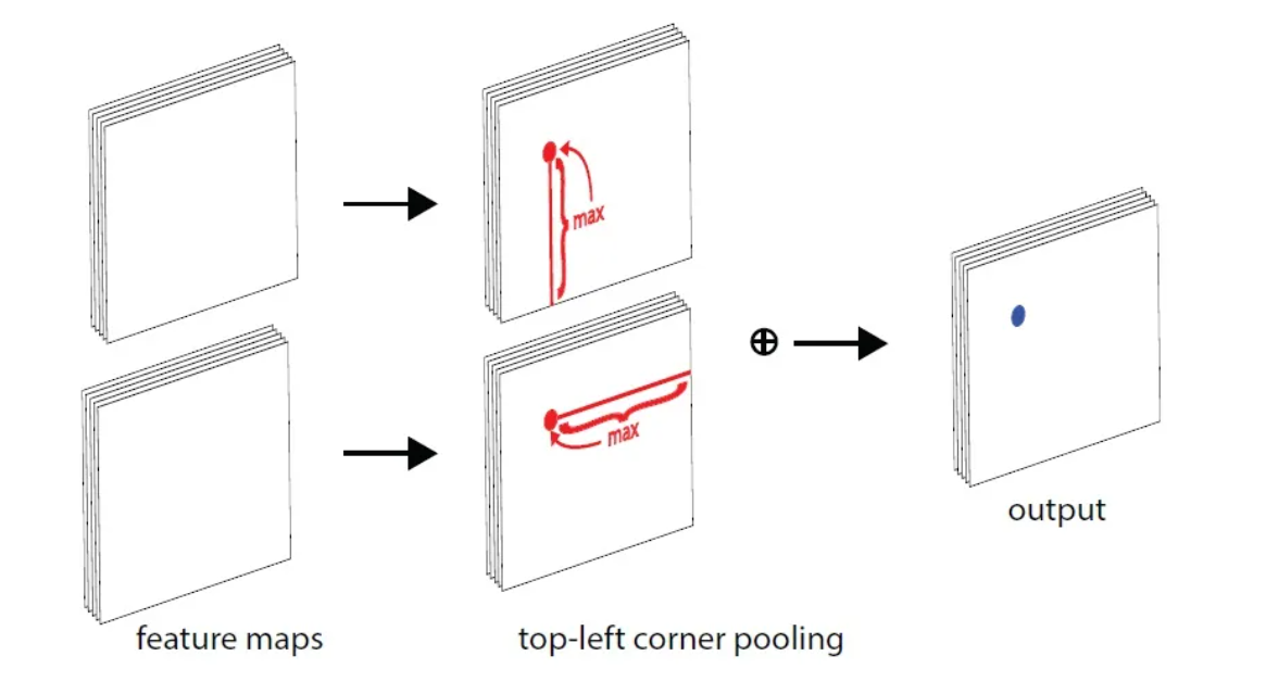 bbox的左上角和bbox的右下角就可以确定目标所在的范围和区域; 若从bbox左上角看物体.横着看,物体在视线的下方.竖着看, 物体在视线的右边; 当求解一个点的top left corner pooling时, 就是以该点为起点, 水平向右看遇到的最大值以及竖直向下看遇到的最大值之和 - 快速实现方法: 方向进行颠倒, 每次都将沿着该方向上遇到的最大值作为填充值即可实现.