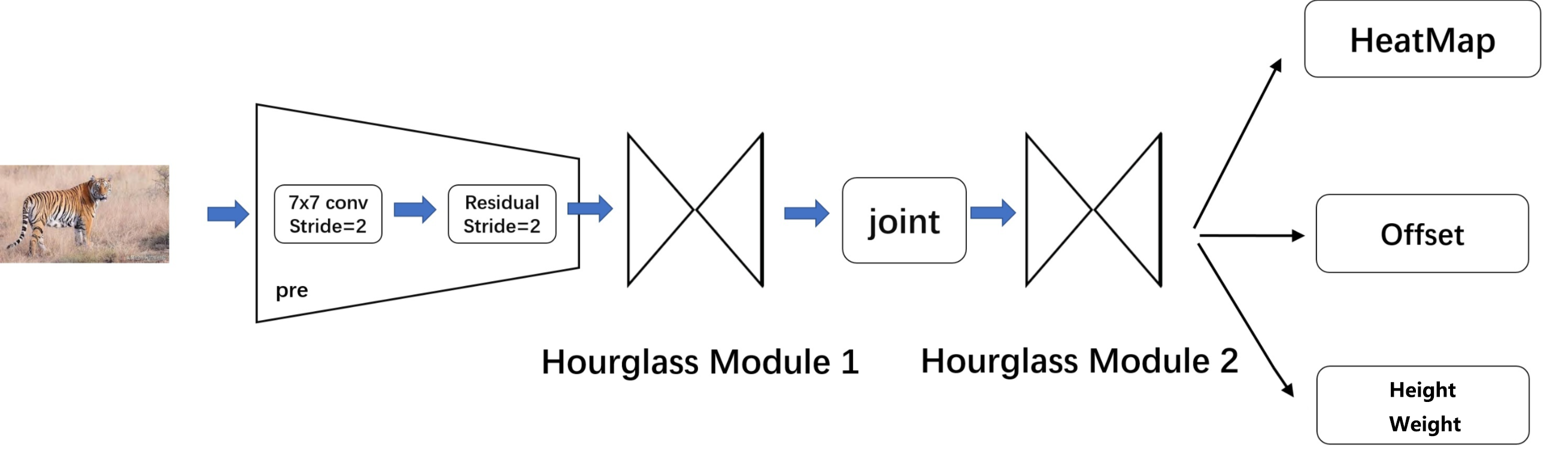 Hourglass Network, 两个沙漏模块头尾相接. 使用两个Hourglass进行堆叠以提高特征提取能力 - Head: 二分支输出