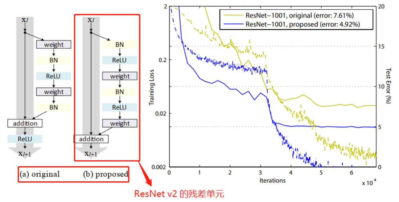 ResNet(>110layers)网络中, 使用预激活残差单元的网络更易训练且精度更高 - 预激活: 将激活函数(