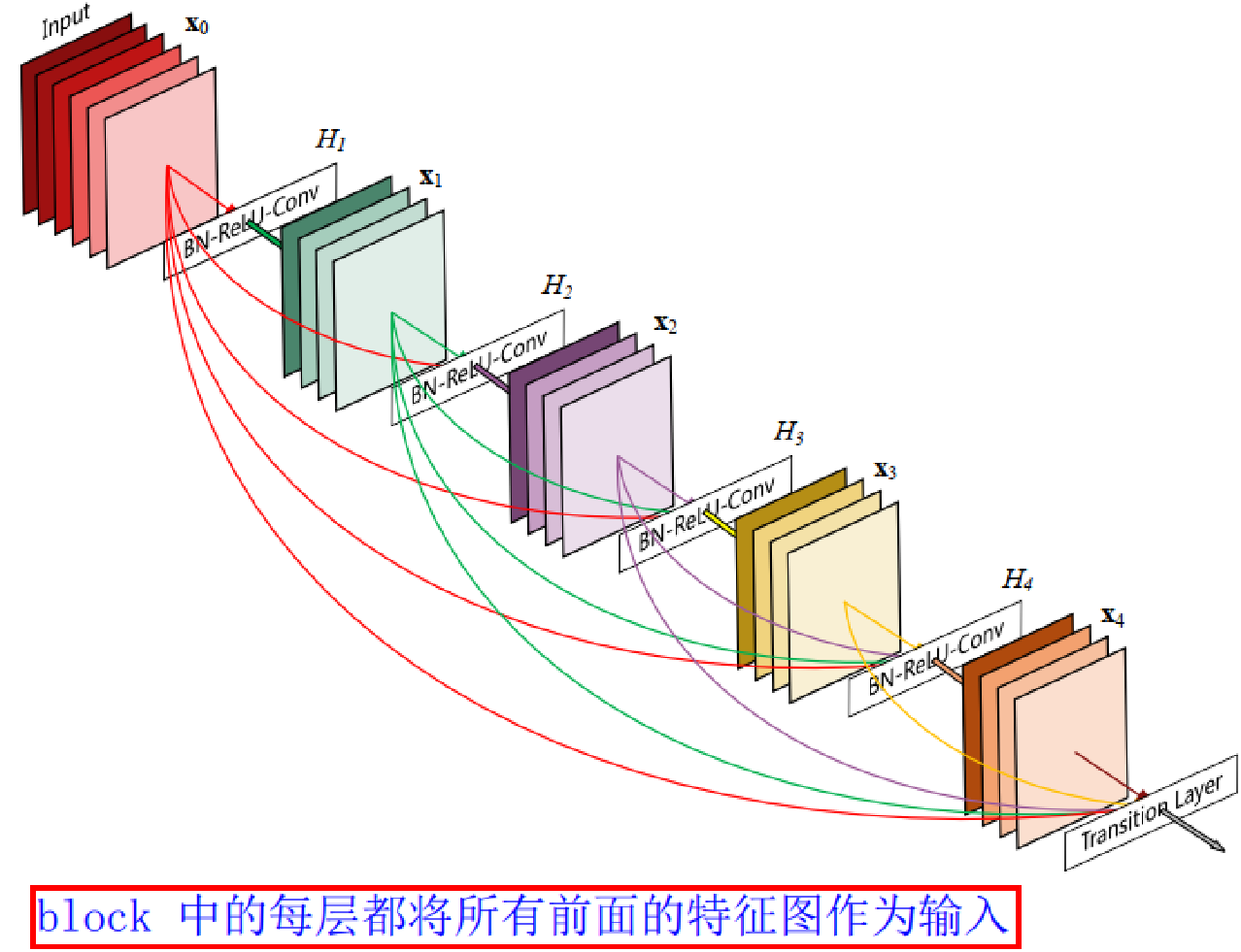 DenseBlock中, 每个网络层的特征图大小是一样的. 是非线性转化函数, 由BN, ReLU, Conv组成 - 在